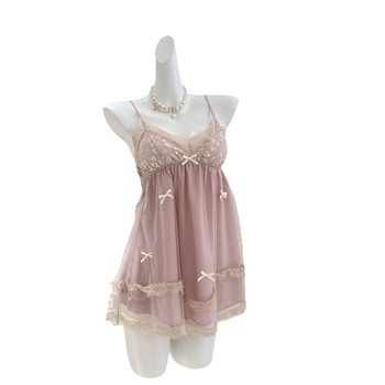 Pink Mesh Strap Dress with Bow Sweet Women's Nightgown Summer Nightdress Girl's Style Home Wear